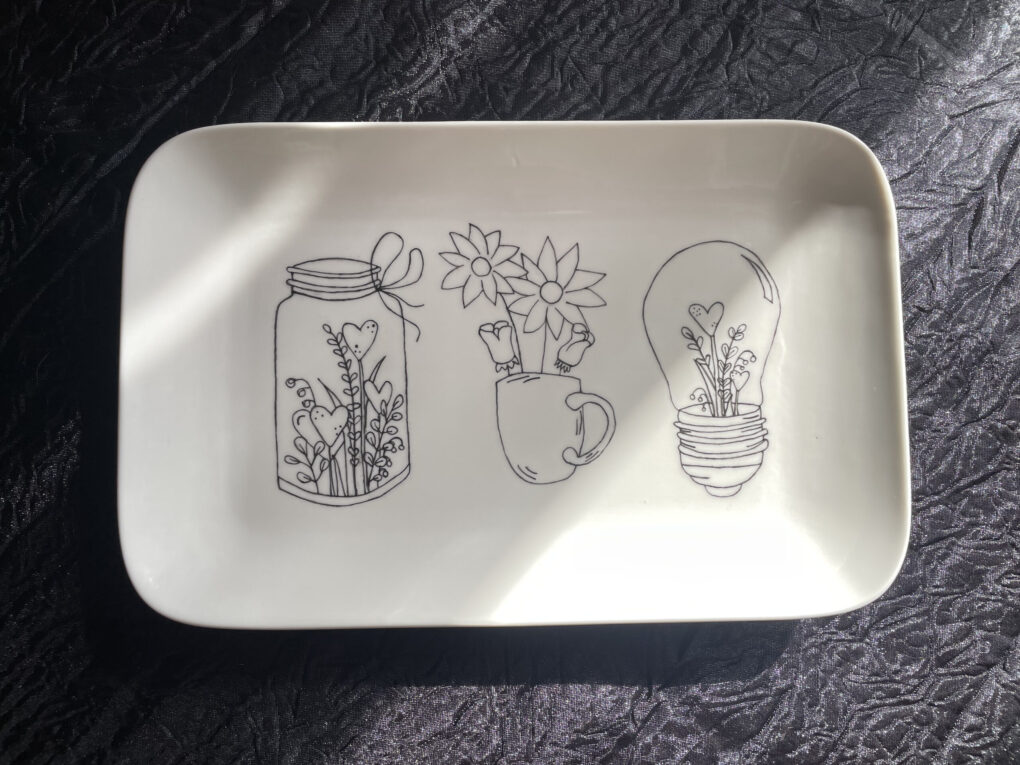 Toutes mes pièces en porcelaine sont cuites à plus de 800 °C. Cette cuisson à très haute température permet à la peinture de fusionner avec l’émail, garantissant une excellente tenue dans le temps. C’est une étape cruciale qui rend les créations résistantes à l’usage quotidien, au lavage et à l’épreuve du temps. Chaque création est pensée pour durer.